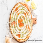 Med laks, rejer, spinat, hvidløg, fløde, tomat sauce
